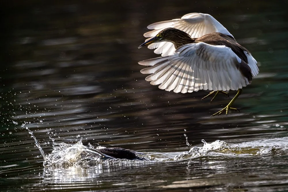 A heron or egret flying just above water, with its wings spread wide, catching something in the water.