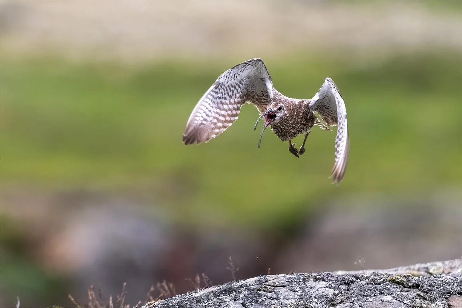 A bird in mid-flight with its beak open, wings spread, and emergency whistle hanging from its mouth, flying above a rocky surface against a blurred green background.