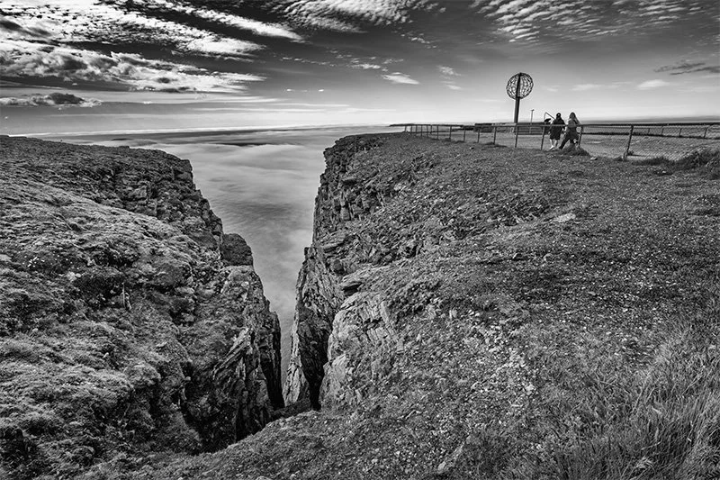 A black and white photo of a cliff at a coast with a deep fissure dividing the land, a fence along the edge, and a globe sculpture with two people standing nearby.