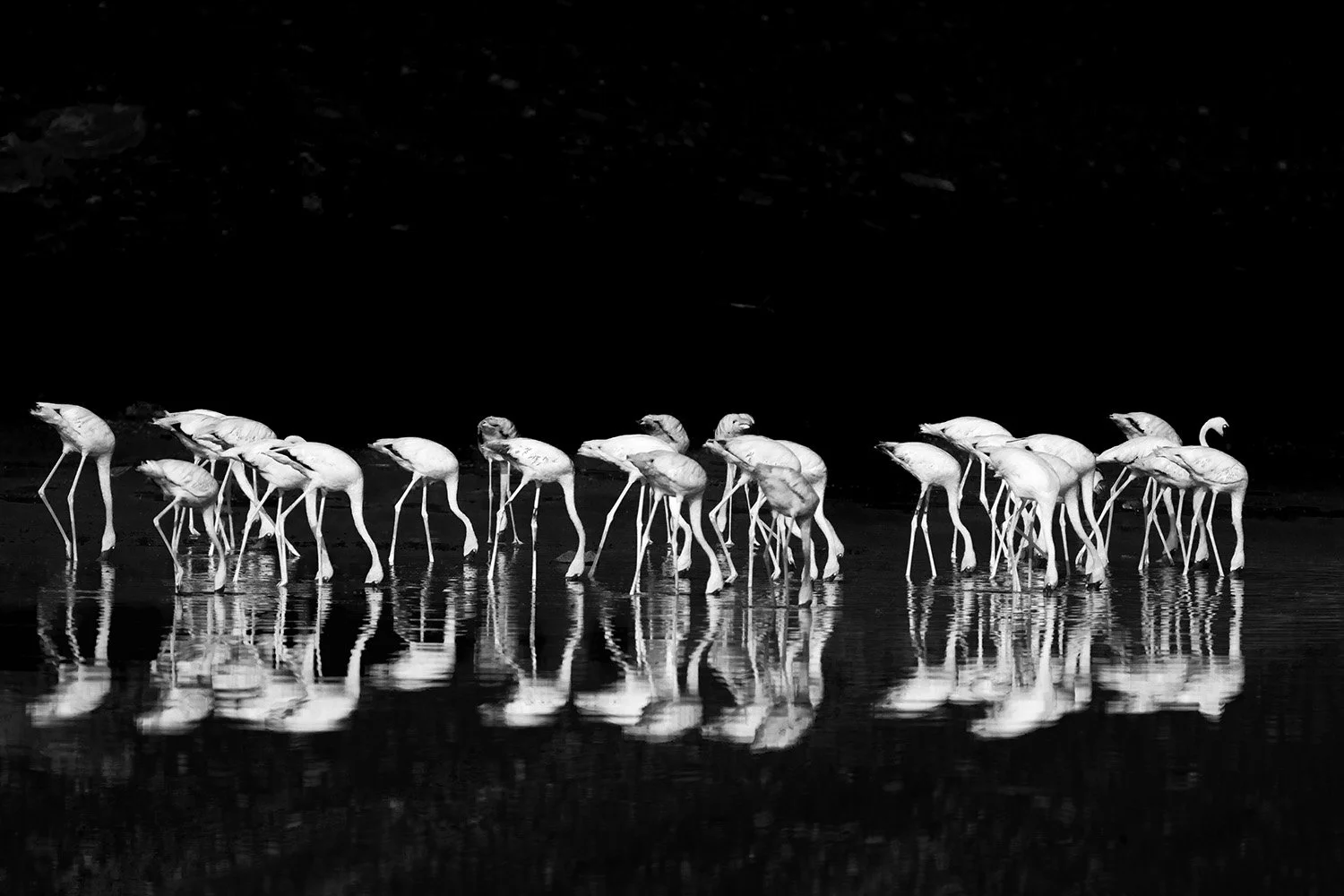 A black-and-white photograph of a flamingo standing against a dark background, with its head bent towards its body.