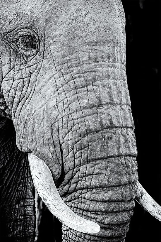 Close-up black and white photo of an elephant's face, showing its eye, wrinkled skin, trunk, and tusks.