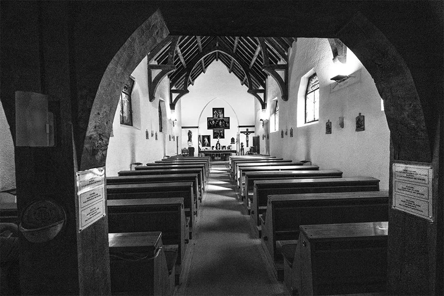A black and white photo of the interior of a small church with wooden pews, altar, and religious icons on the walls.