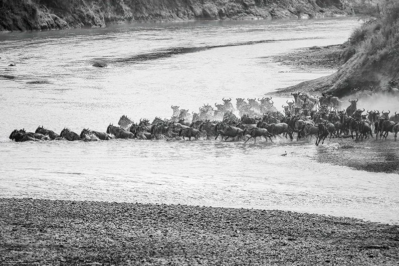 Black and white photo of a waterfall cascading into a river with rocks, surrounded by rugged terrain and hills.